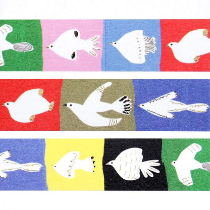This striking design features hand-drawn white birds, each appearing within its own block of colour—like small illustrated “rooms” arranged in a rhythmic sequence. Bold panels of red, blue, green, yellow, and pink create a lively patchwork backdrop, while the simplified bird forms keep the design balanced and modern. Subtle gold foil accents add warmth and a gentle shimmer, elevating the playful composition with a refined finish.